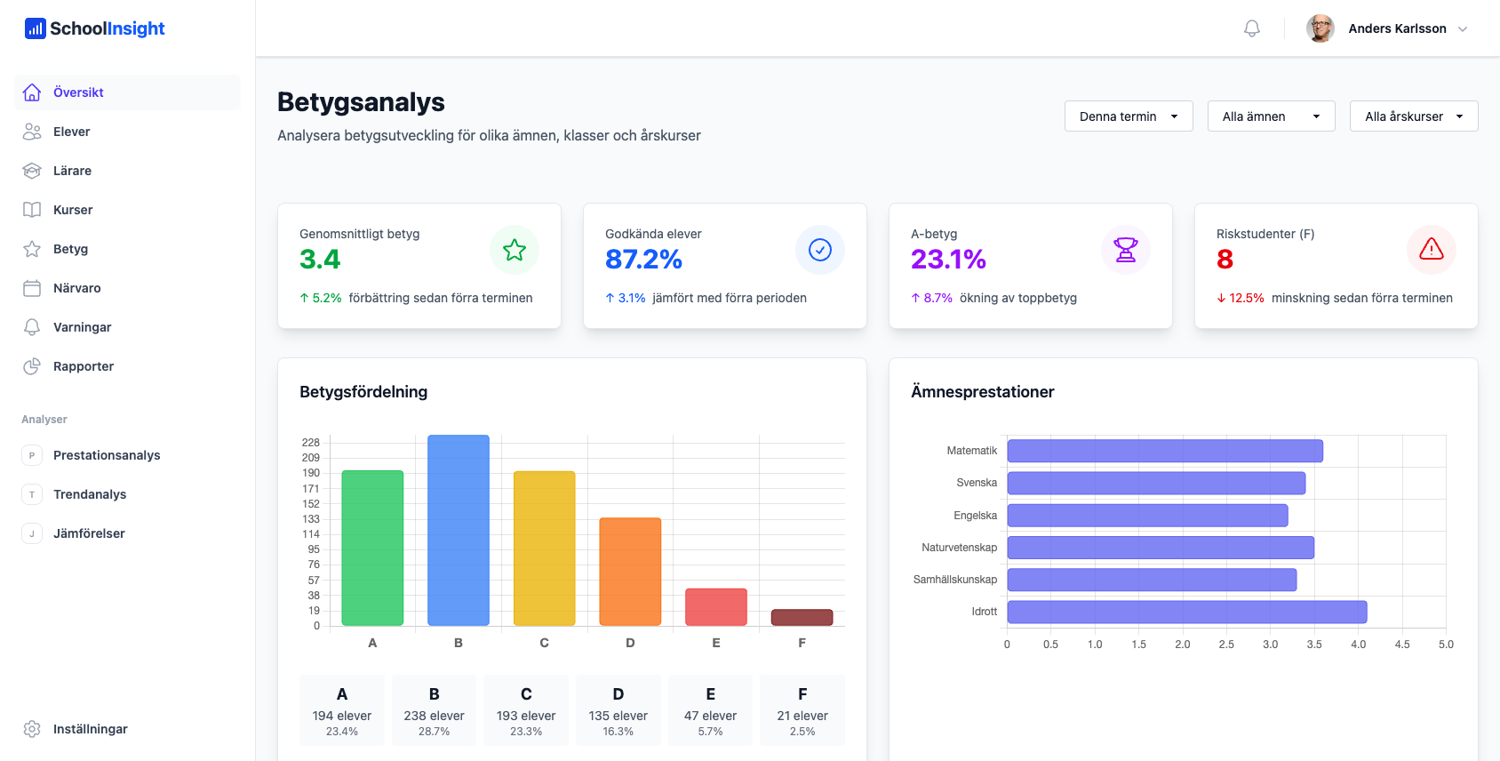 Analysera betygsutveckling för olika ämnen, klasser och årskurser. Jämför resultat mot nationella mål och tidigare prestationer.