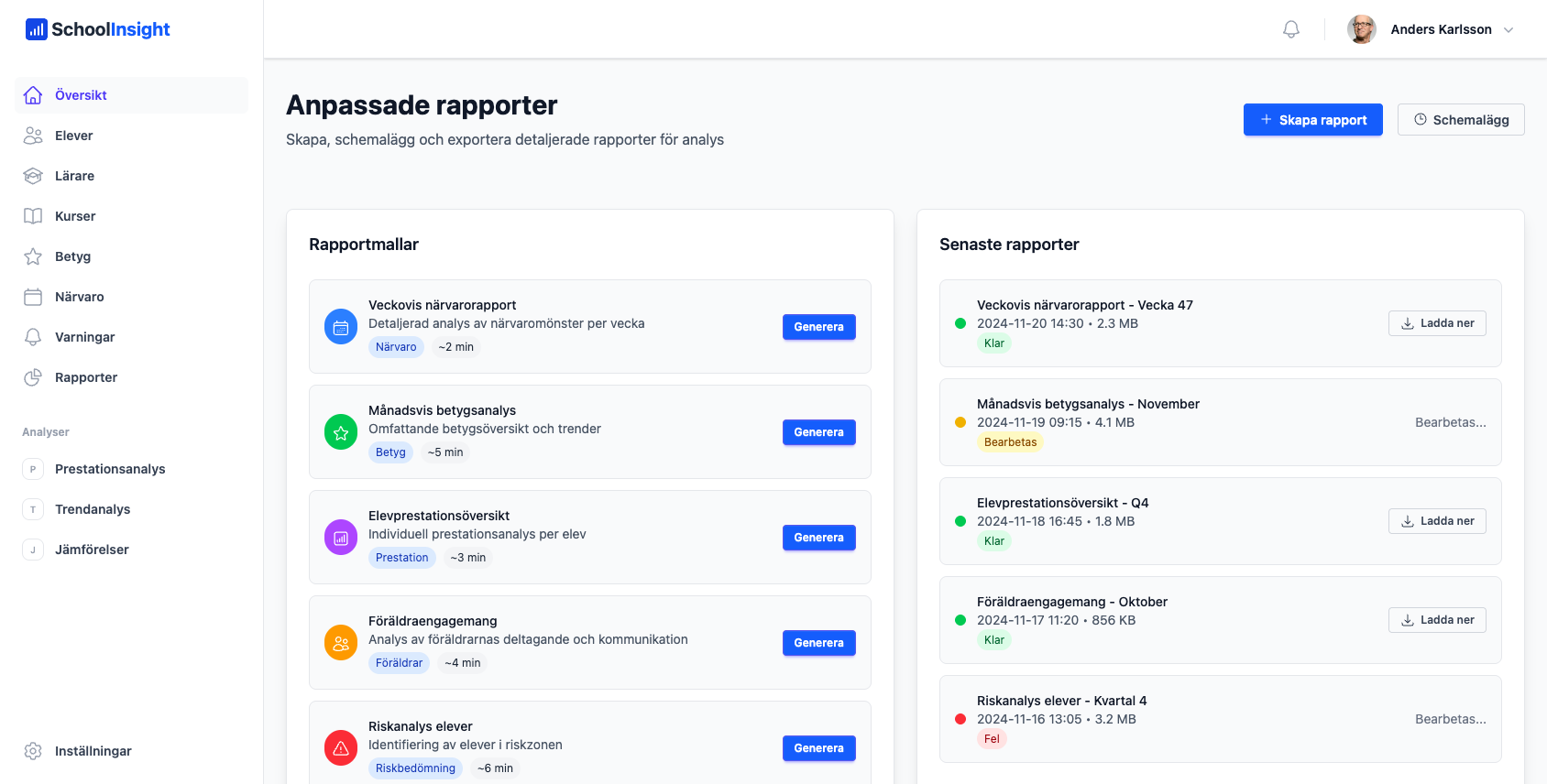 Skapa skräddarsydda rapporter för skolledning, lärare och föräldrar. Exportera data i flera format för vidare analys.